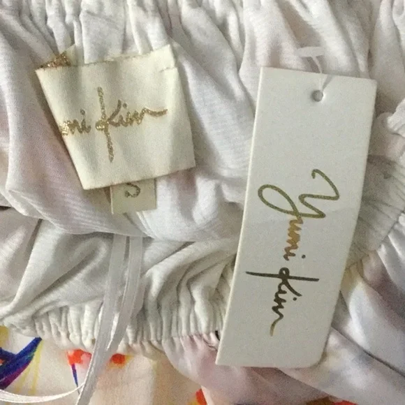 NWT Yumi Kim Silk Floral Maxi Dress Size Small Gorgeous silk maxi dress in silk lined in polyester. Must be dry cleaned.Deep v neck similar to a bikini top. Thin spaghettis straps lace up an open back. Thick elastic empire waist.Floral print is gold, purple, cobalt and orange on white. The empire waist is 18” unstretched and easily stretches to 32”. Measures from the top of triangle on top it is 57” long. It flares out to 72” around the hem. Brand new with tags.