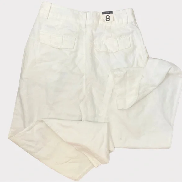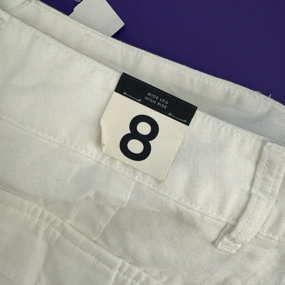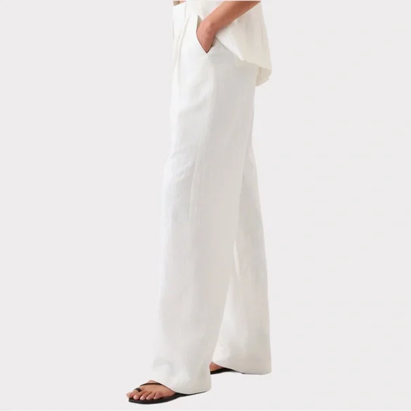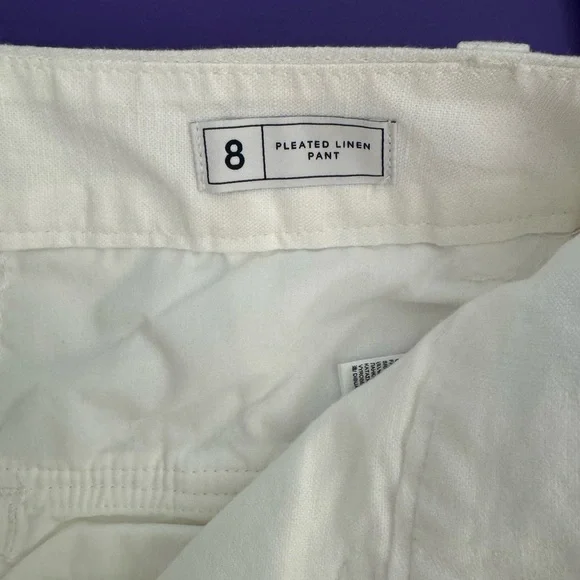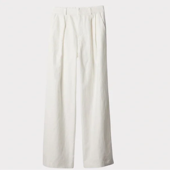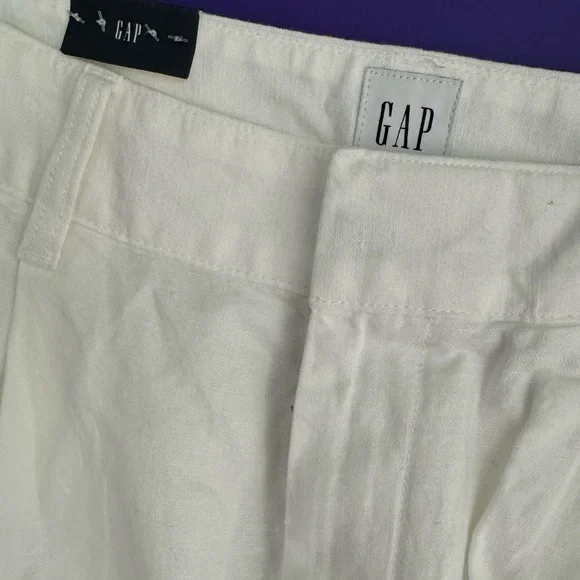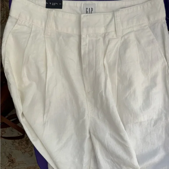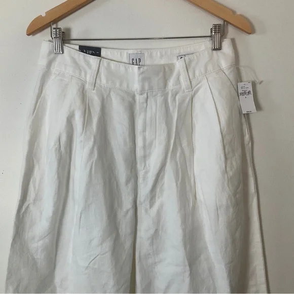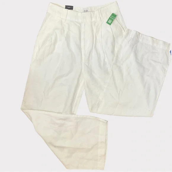 NWT | GAP | High Rise Linen-Cotton Pleated Wide Leg Pants | Soft White | 8GAP’s “soft-structured, effortless essential - now in a linen blend.”DETAILS: - Size 8- New with tags - Never worn - No flaws - Color: Soft white - Linen 55%, Cotton 45%- Machine wash.- Imported- Fit: Classic. An easy silhouette that fits close at the waist, and is relaxed through the hips and thigh- Soft linen-cotton blend trousers.- E-waist with concealed hook and bar closure, zip fly.- Front slant pockets, back welt pocketsMEASUREMENTS (approximate,flat,across): Waist: 15”Inseam: 29.5”Rise: 14”* Smoke Free and Pet Free Home* Ships Next Day Guaranteed