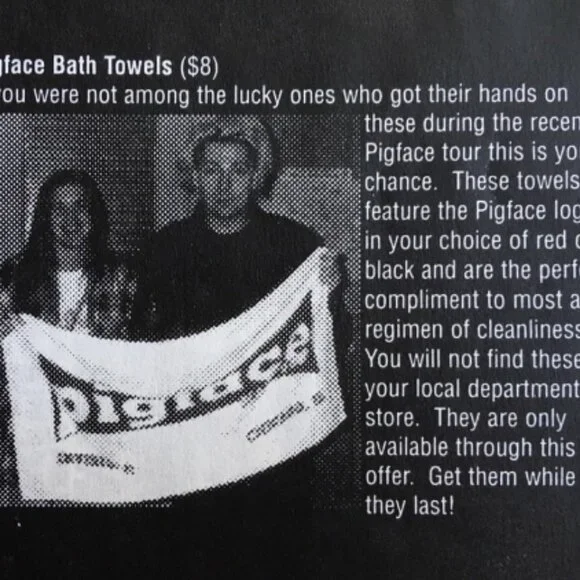 PIGFACE Bath TOUR TOWEL Team 1994 Promo Only Rare Large Ministry Wax Trax Industrial Martin Atkins Swans Nine Inch Nails Cult Psychic TVARTIST: PIGFACETITLE: PIGFACE TEAM '94 PROMO ONLY TOUR TOWELCONDITION: NEWEXTRAS & DETAILS:VERY RARE UNUSED 3.5' X 2'(feet) PROMO ONLY CLOTH TOWEL FROM THE 1994 TOUR.THIS ITEM IS RARELY IF EVER SEEN.LABEL: INVISIBLECOUNTRY OF ORIGIN: USDATE: 1994An "industrial supergroup" of people playing music, line ups (for studio and touring) don't really stay the same: with the exception of Martin Atkins on drums. "Obviously the credit for Pigface does not belong here with me - there have been so many people who have paved the way for this artistic expression, giving to the idea freely not 'as if' but because it was and is their own.. it's strange to describe the reality that something which is such a part of myself and the Invisible Label belongs in whole, not in part, to so many other people - the band and audience".WE ONLY SELL VINTAGE MEMORABILIA,POSTERS, SHIRTS & HATS. NO REPRODUCTIONS!Thanks and happy shopping!A VERY UNIQUE COLLECTABLE AND ONE THAT IS SURELY NOT TO SEE THE LIGHT IF DAY AGAIN!!